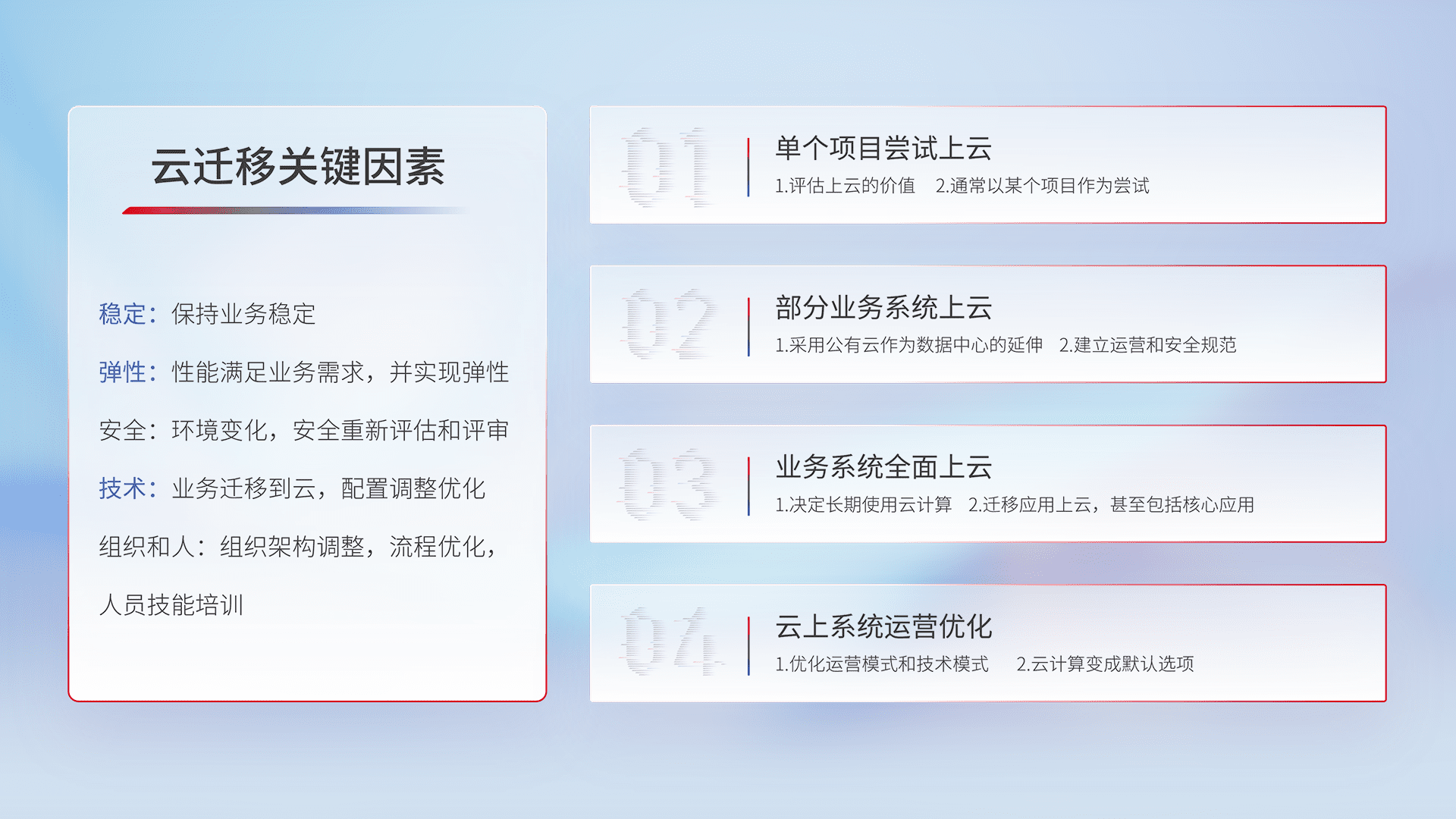 结合实际业务,,,从规划设计、、云平台选型、、、、云原生改造、、、数据迁移、、集成交付,,,,迁移全过程为客户识别最佳上云路径,,做好风险识别管理,,设计网络架构、、身份权限、、、安全审计合规、、、操作审计、、、、日志审计、、、监控告警策略、、多站点容灾设计等,,,对云上基础设施进行整体规划,,提升IT治理水平,,,,以满足弹性、、、、高可用、、、、高性能的需求。。