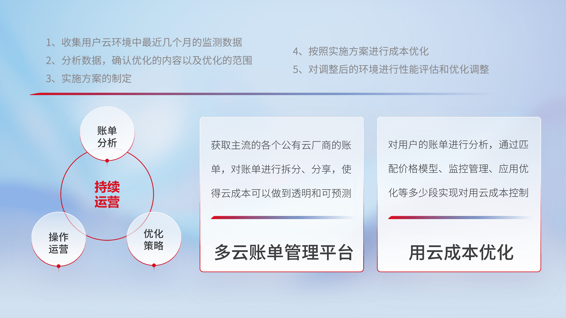 通过多云纳管,,以统一的资源数据模型把客户的云资源进行抽象和封装,,,进而实现对多云资源的统一操作,,,保障云资源管理的可靠性、、稳定性与可用性。。。量身定制化运维内容,,,配置、、、开发运维、、、、补丁管理、、、、备份、、监控、、认证和访问管理、、、审计和日常巡检等,,,,保障在用云过程中的可靠度,,稳定度以及高可用率。。
